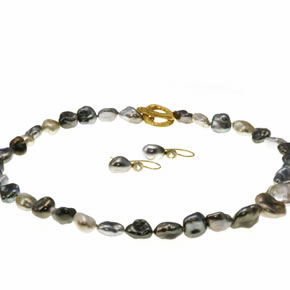 Keshiperle "multicolor" 900/000 Gelbgold, Knebelschloss / 750/000 GG Keshiperle barock, himmelblauer Brillant 0,18ct vs